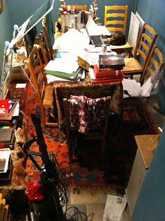 I write in the cellar, which also doubles as a dining room. I also share it with the washing and the hoover. Here is the view this afternoon as I finish off chapter 11. Of particular note is the ubiquitous diet coke can, and my cat in a warm spot by the radiator. The cat also likes to walk on the keyboard at crucial moments and to stick its nose into buttered toast.