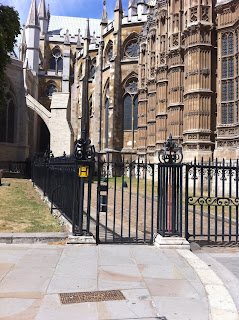 Despite some strange looks, I’ve been studying the pavement outside the east end of Westminster Abbey recently. We know that in 1834 there was a street plug (ie access to underground fire mains) in “Speaker’s Corner”, which was the name for the outside area between the apse of Henry VII’s chapel and the Chapter House (as well as the better known area inside). I’m wondering if the water main still flows along the same route and this manhole cover is the current day access to it – signalled by the yellow fire hydrant sign. A tad nerdy maybe…?