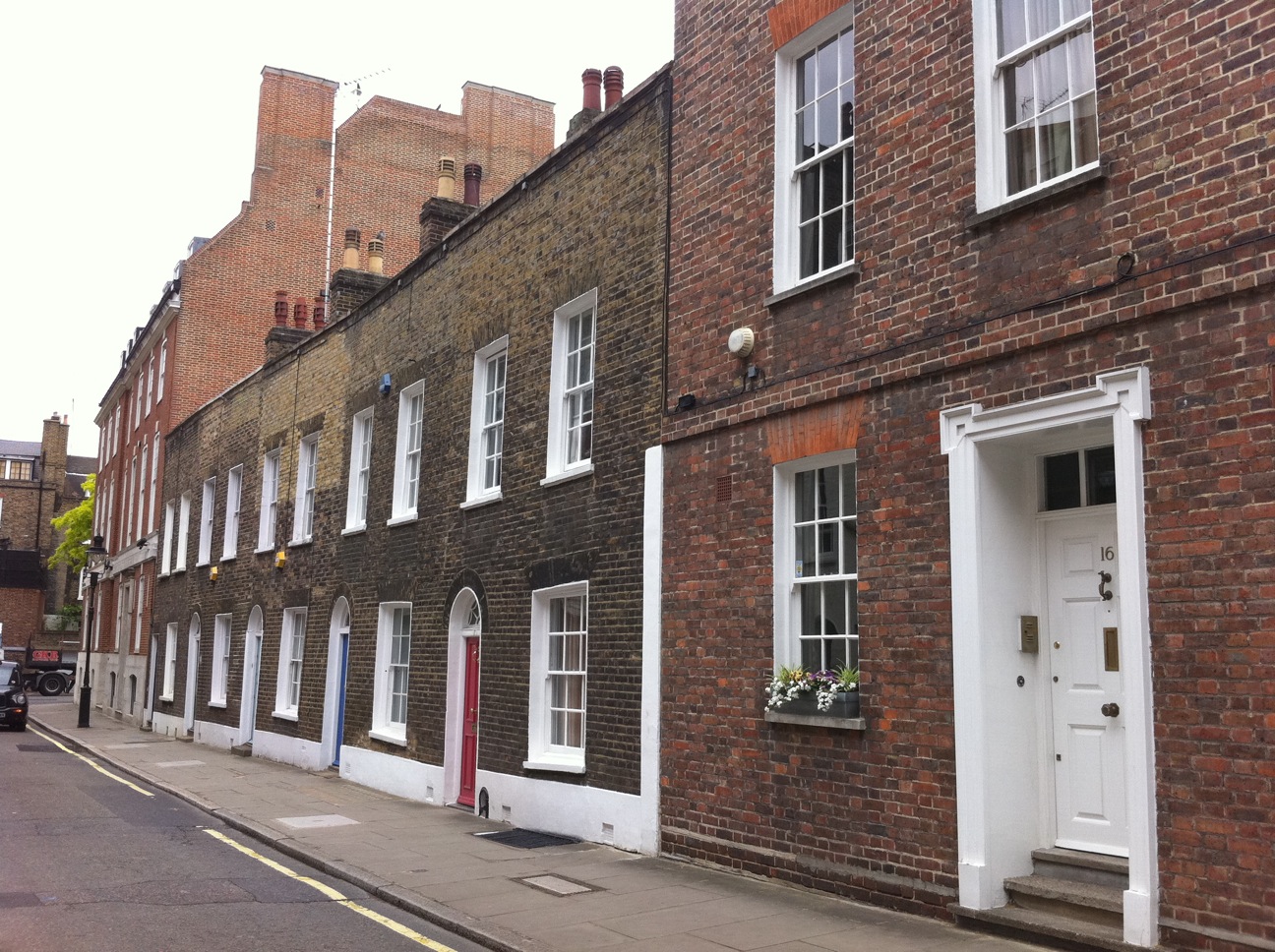 More modest dwellings on Gayfere Street – I love the wonky line of the windows and door frames of the terrace. |